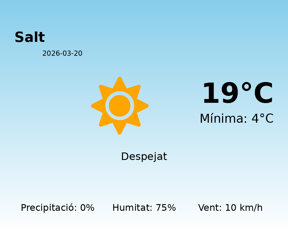 En resum, avui a Salt podrem gaudir d’un dia molt estable, amb temperatures agradables, absència de precipitacions i un ambient confortable. Gaudiu del bon temps!