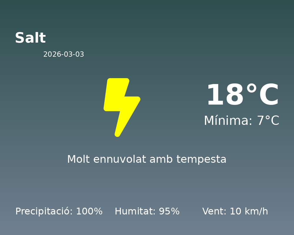Benvolguts habitants de Salt, avui, 3 de març de 2026, podem esperar un dia marcat per condicions meteorològiques força humides. La temperatura màxima arribarà als 18 °C, mentre que la temperatura mínima se situarà al voltant dels 7 °C.