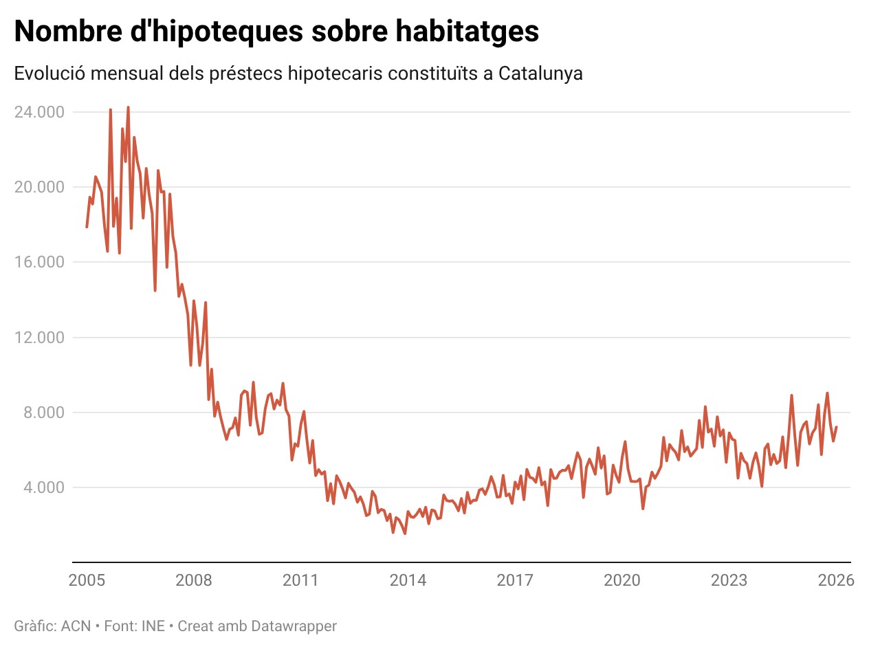 ACN Barcelona – Catalunya comença el 2026 amb 7.212 hipoteques sobre habitatge inscrites, la dada més alta d’un mes de gener des del 2011, quan n’hi va haver 7.366, i ja encadenen 20 mesos d’increments interanuals, segons les xifres que ha actualitzat l’Institut Nacional d’Estadística (INE) aquest dimarts. Les hipoteques signades per comprar un pis o una casa han crescut un 4% en comparació amb el gener del 2025, un increment interanual més moderat que el de l’any anterior (14,42%). De mitjana, els préstecs van ser de 187.838 euros, un 8,61% més que l’any passat i un rècord per al primer mes de l’any. És el segon cop des del 2007 que el capital mitjà prestat supera els 180.000 euros per hipoteca en un mes de gener.