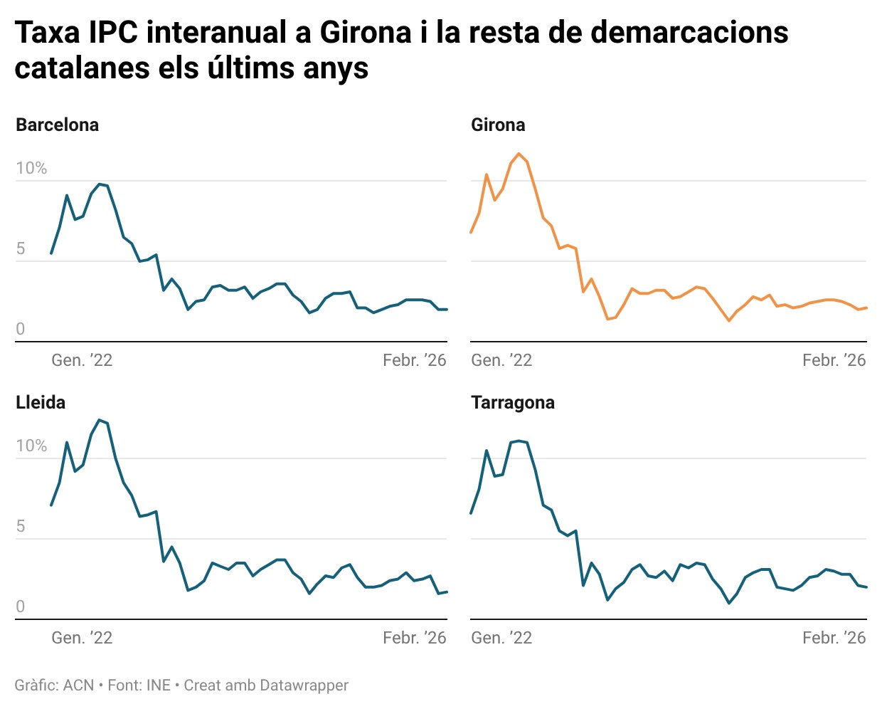Mirant el calendari, aquest percentatge se situa en el mateix valor del maig de l’any passat (quan l’IPC interanual també va situar-se al 2,1%). Sí que és veritat, però, que al llarg del 2025 la inflació interanual no va superar en cap moment el 3% i va fluctuar, això sí, per damunt del 2% (assolint el màxim el mes de febrer, quan l’IPC interanual va tancar al 2,9%). Caldrà veure ara l’impacte damunt els preus que tindrà la guerra al Pròxim Orient i com això es trasllada a la inflació.