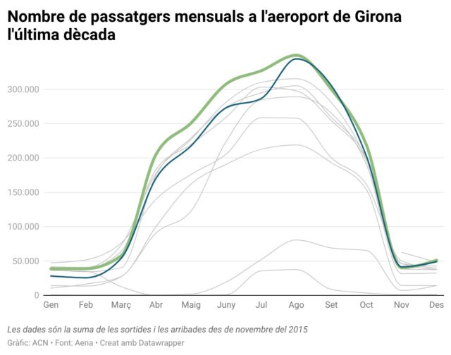 ACN Vilobí d’Onyar – L’aeroport de Girona ha tancat el millor any des del 2013 en volum de passatgers, després d’arribar als 2.185.561 usuaris el dia 31 de desembre. Es tracta d’un dels objectius que tenia la taula estratègica de l’aeroport pel 2025 i suposa un augment de passatgers del 9,4% en comparació amb l’any anterior. Pel que fa al volum d’operacions, s’han fet 28.000 aterratges i enlairaments al llarg de tot l’any, que suposa un increment del 15,2% de l’activitat en comparació amb el 2024. En concret, les dades del desembre han permès afegir 51.000 passatgers al còmput global de tot l’any. Aquesta xifra suposa un 4,6% més dels que hi havia a l’anterior any.