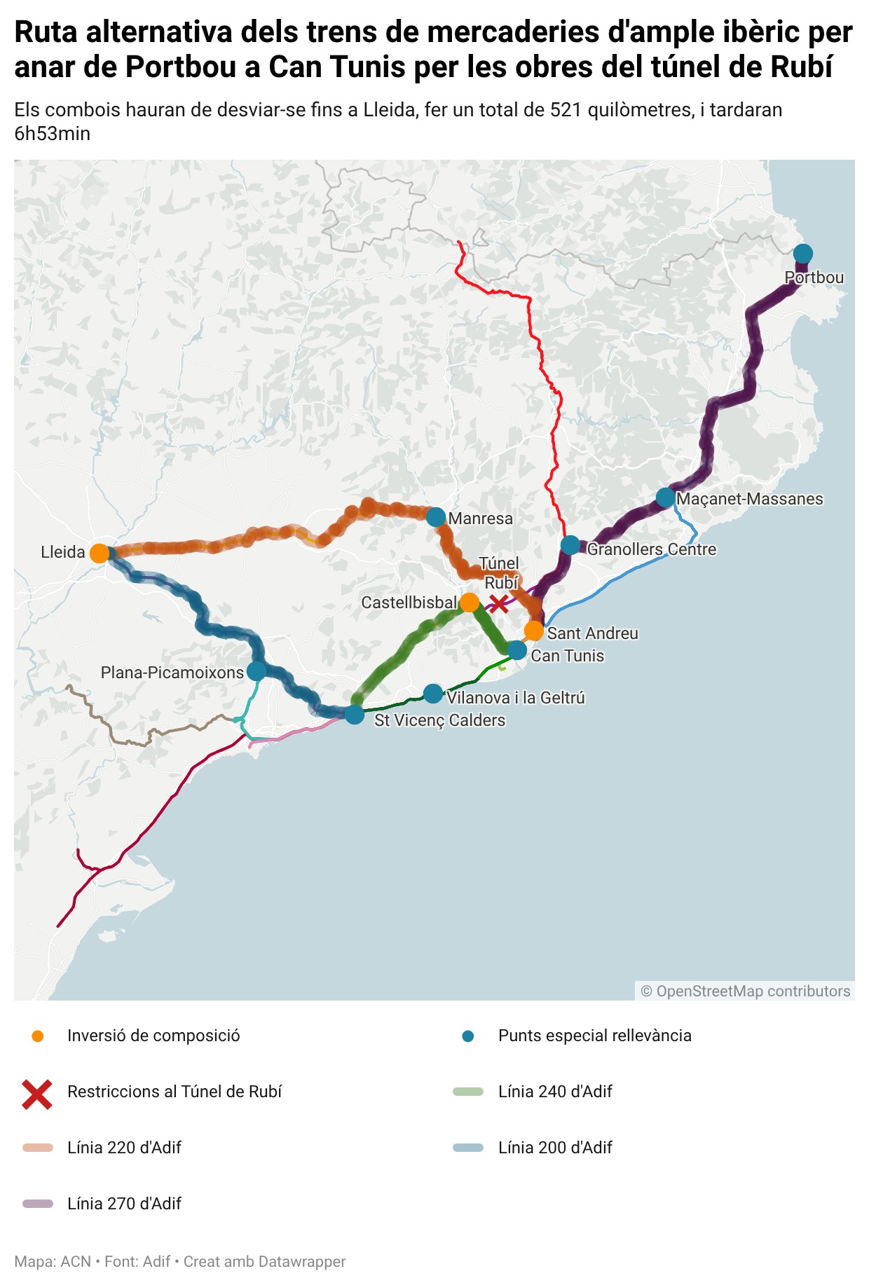 ACN Tarragona / Girona – Les obres al túnel de Rubí que el deixaran inoperatiu durant set setmanes obligaran a incrementar significativament els temps de viatge i els quilòmetres als trens de mercaderies que circulin per les vies d’ample ibèric i que vulguin anar des de l’estació de Portbou fins a Can Tunis i el port de Barcelona. Segons un document d’Adif enviat a diferents agents al qual ha tingut accés l’ACN, els combois que vinguin de França tardaran fins a set hores per arribar a Can Tunis, mentre que amb el túnel operatiu tardaven 2 hores i 42 minuts. La raó són els desviaments, ja que els combois han de passar per Lleida i Sant Vicenç de Calders, fet que incrementa la distància que han de recórrer dels 192 quilòmetres fins als 521.