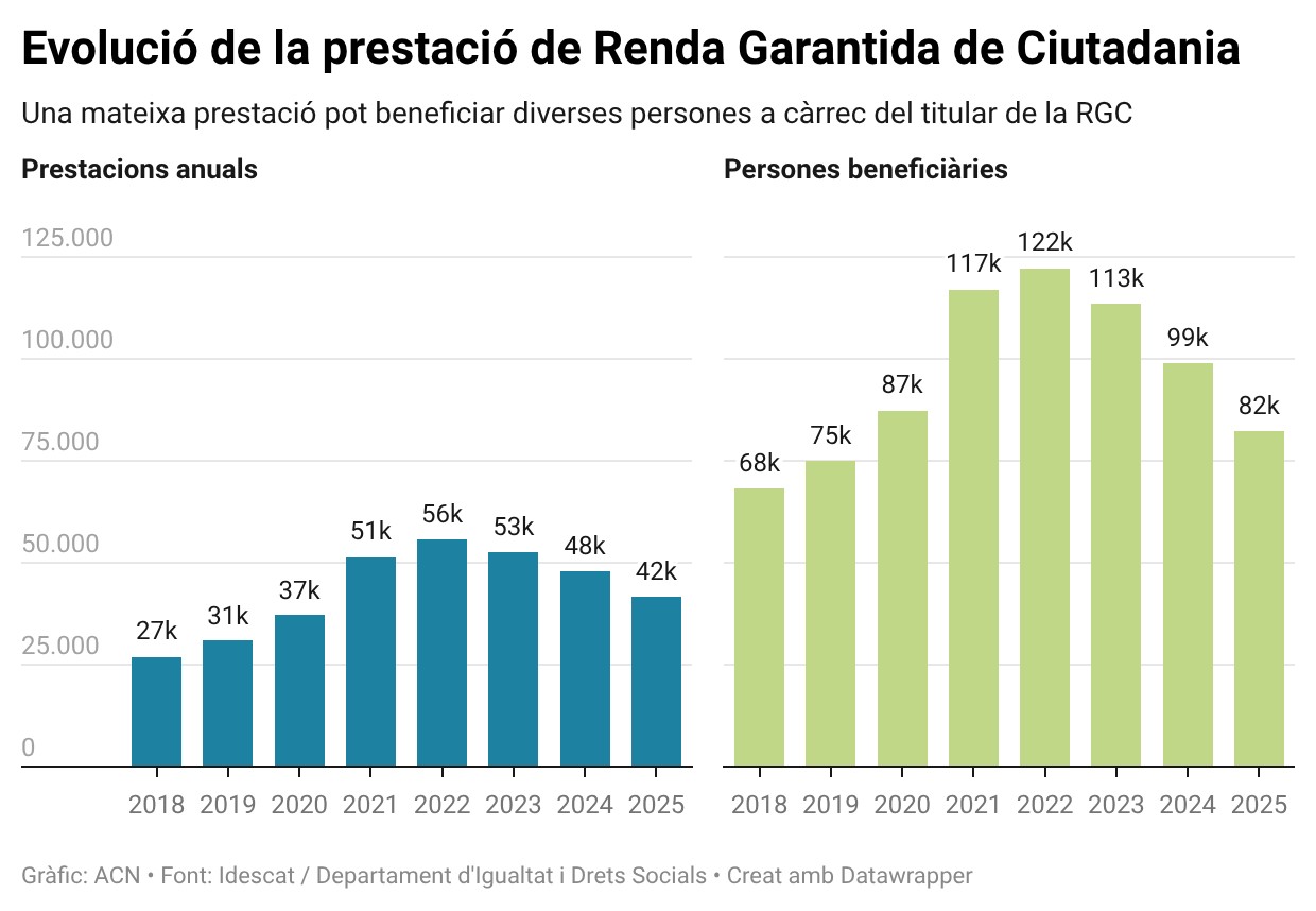 Des de l’any 2022 el nombre de prestacions i de beneficiaris de l’RGC es redueixen anualment. La caiguda entre aleshores i l’any passat és de més de 14.000 expedients, un 25% menys de prestacions. I pel que fa al nombre de beneficiaris (un mateix expedient beneficia els convivents menors o dependents del titular), el 2025 se’n compten prop de 40.000 menys, dels 122.000 de tres anys enrere als 82.200 del 2025, amb xifres rodones.