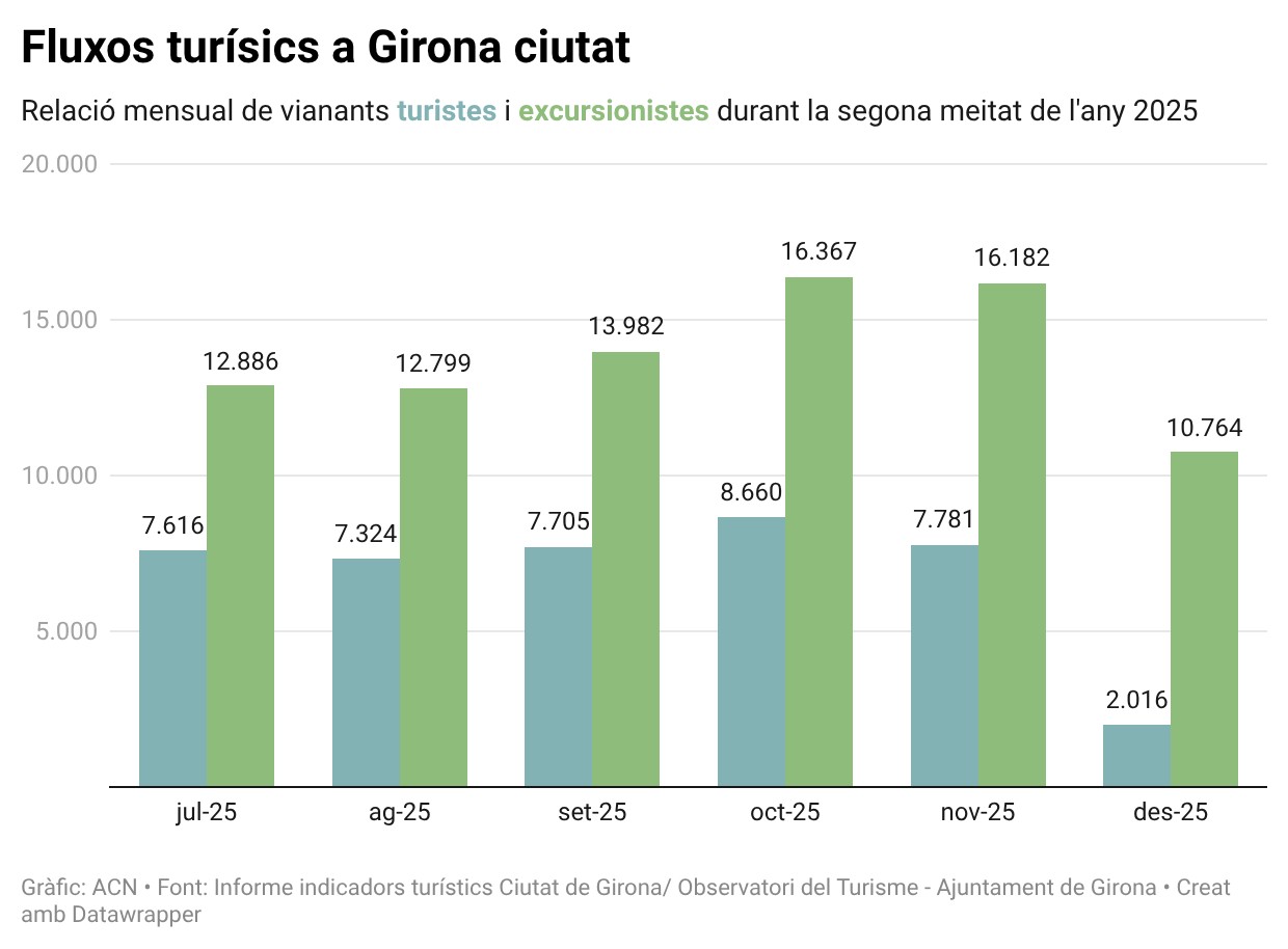 ACN Girona – Sis de cada deu turistes que visiten Girona fan excursions d’un dia a la ciutat i els que s’hi allotgen hi dormen dues nits de mitjana. Ho recull un informe que per primer cop incorpora les dades de la xarxa de sensors que va instal·lar l’Ajuntament. Els dispositius, concentrats al Barri Vell, compten els turistes a través dels mòbils. L’informe també conclou que el 2025 a Girona hi ha hagut “una evolució moderada” de l’activitat turística. La vicealcaldessa Gemma Geis subratlla que, al costat de garantir l’equilibri amb la ciutadania, l’aposta també demana atraure visitants “de qualitat” -entre d’altres, fent que incrementin la despesa- i posa en relleu que les dades de l’informe avalen haver implantat la nova taxa per als busos.